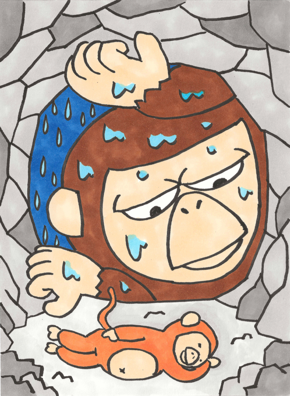 ほら穴の中にどっかりと居座る大ザルを見て、どうしても追い出せないと知った小ザルは、降り続く雨の中を当てもなくとぼとぼと立ち去っていった。
